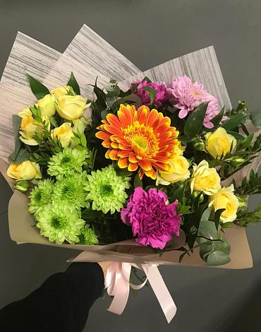 Сочный коктейль из цветов совершенно разных, казалось бы несочетаемых оттенков, на самом деле выглядит очень привлекательно и заманчиво. Этот небольшой, но очень броский и запоминающийся букетик, такой же многогранный, как огни ночных городов. Флористы умело соединили в нем гвоздику и герберу, кремовую розу, солнечные хризантемы и зелень.
